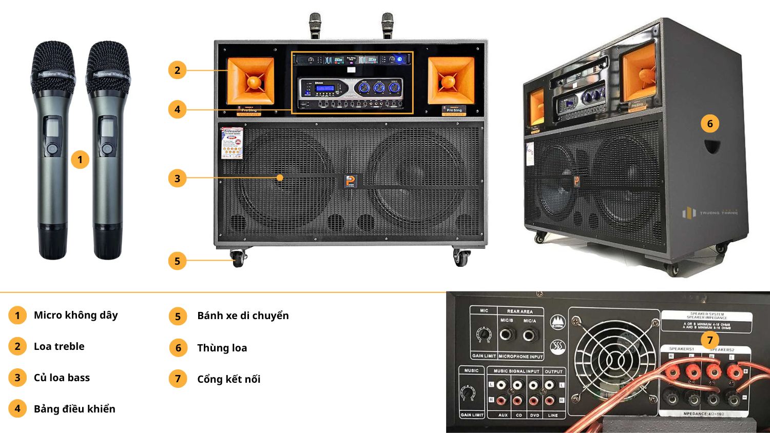 - Thùng loa: Đây là lớp vỏ ngoài có chức năng bảo vệ loa, được làm từ gỗ hoặc nhựa cao cấp, được trang bị thêm bánh xe và tay kéo để thuận tiện di chuyển.