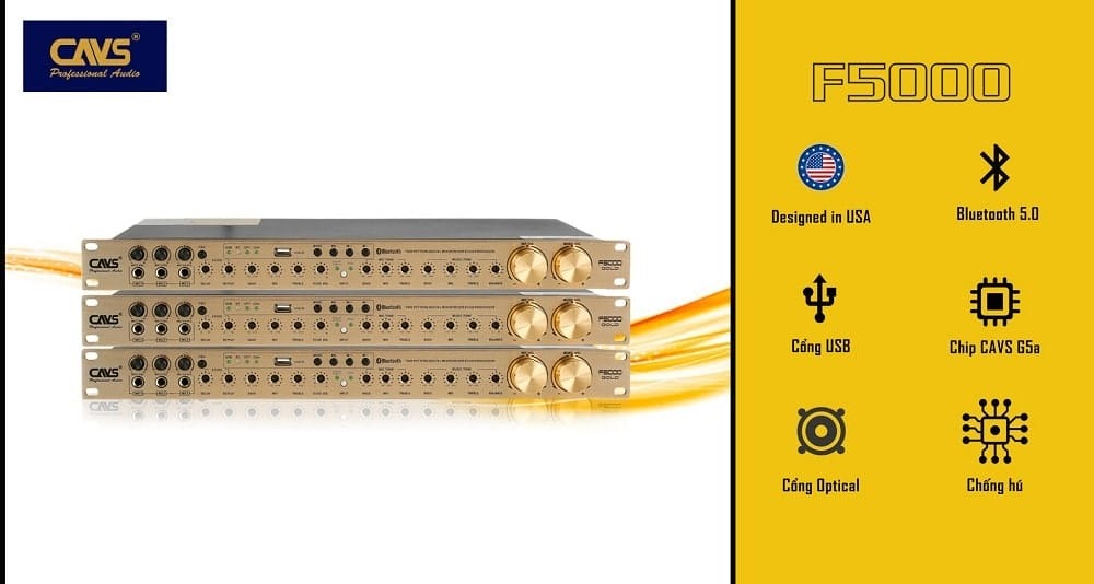 - CAVS F-5000 Gold được thiết kế với 4 đường vào của Micro tiện lợi hơn cho các phòng hát karaoke gia đình hay kinh doanh